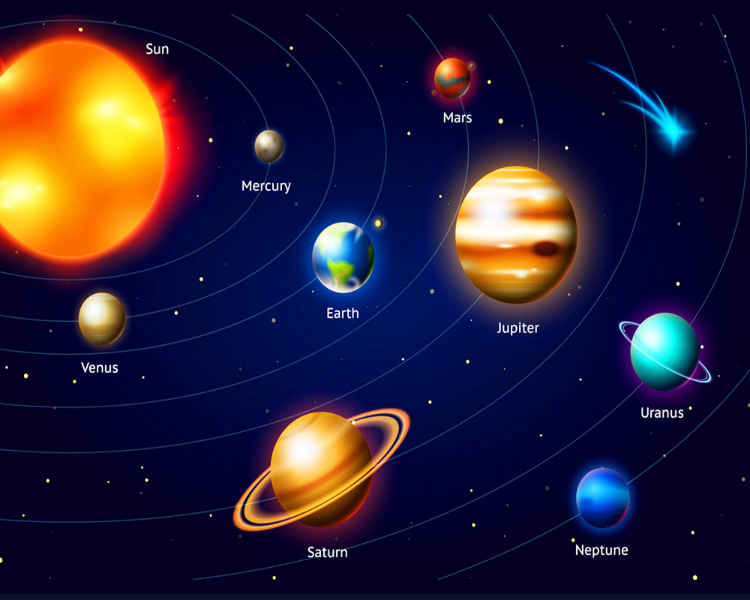 8 hành tinh chính: Sao Thủy, Sao Kim, Trái Đất, Sao Hỏa, Sao Mộc, Sao Thổ, Sao Thiên Vương, Sao Hải Vương.