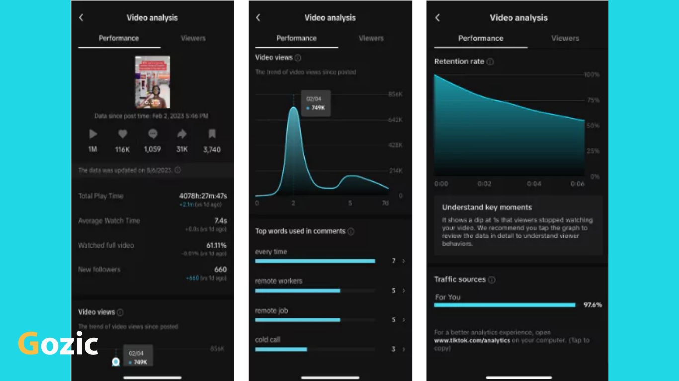 Vào TikTok Analytics → Tab “Nội dung” để xem:
