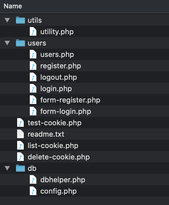project/ │ ├── db/ │ ├── config.php │ └── dbhelper.php │ ├── utils/ │ └── utility.php │ ├── register.php ├── login.php ├── users.php ├── logout.php │ ├── form-register.php ├── form-login.php │ ├── test-cookie.php ├── list-cookie.php ├── delete-cookie.php └── readme.txt
