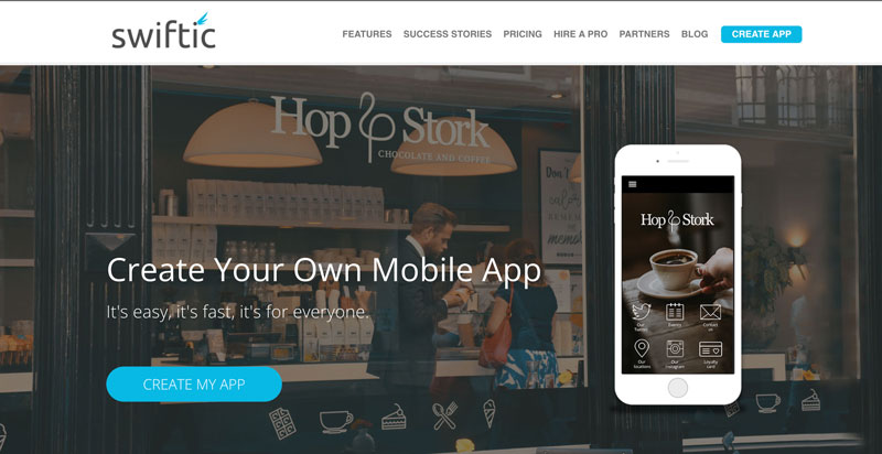 Một trong những nền tảng thiết kế app miễn phí hiện nay có tên là Swiftic. Nó cho phép bạn tạo ứng dụng bất kỳ, đơn giản với nhiều chủ đề được phân loại sẵn. Các tính năng trên Swiftic bao gồm: theo dõi hiệu suất ứng dụng, kéo thả, đánh giá người dùng, chương trình khuyến mãi, menu tuỳ chỉnh, tuỳ chỉnh giao diện, thông báo đẩy,...