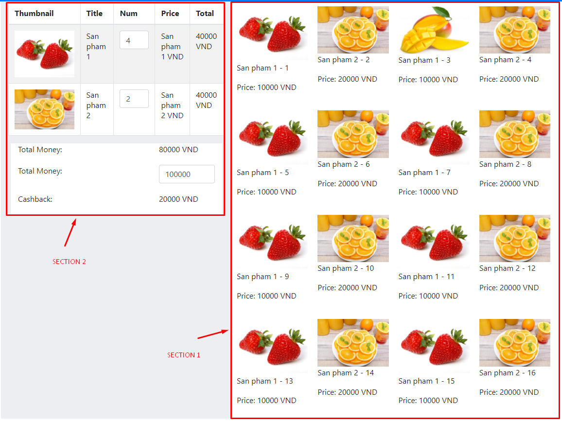 - Khi người dùng click vào từng sản phẩm trong SECTION 1 -> cập nhật thông tin tương ứng trong SECTION 2
