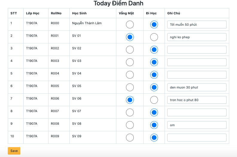 - Click vào lớp học : Hiển thị ra bảng cho phép điểm danh như hình sau. Nếu đã điểm danh thì cho phép cập nhật lại