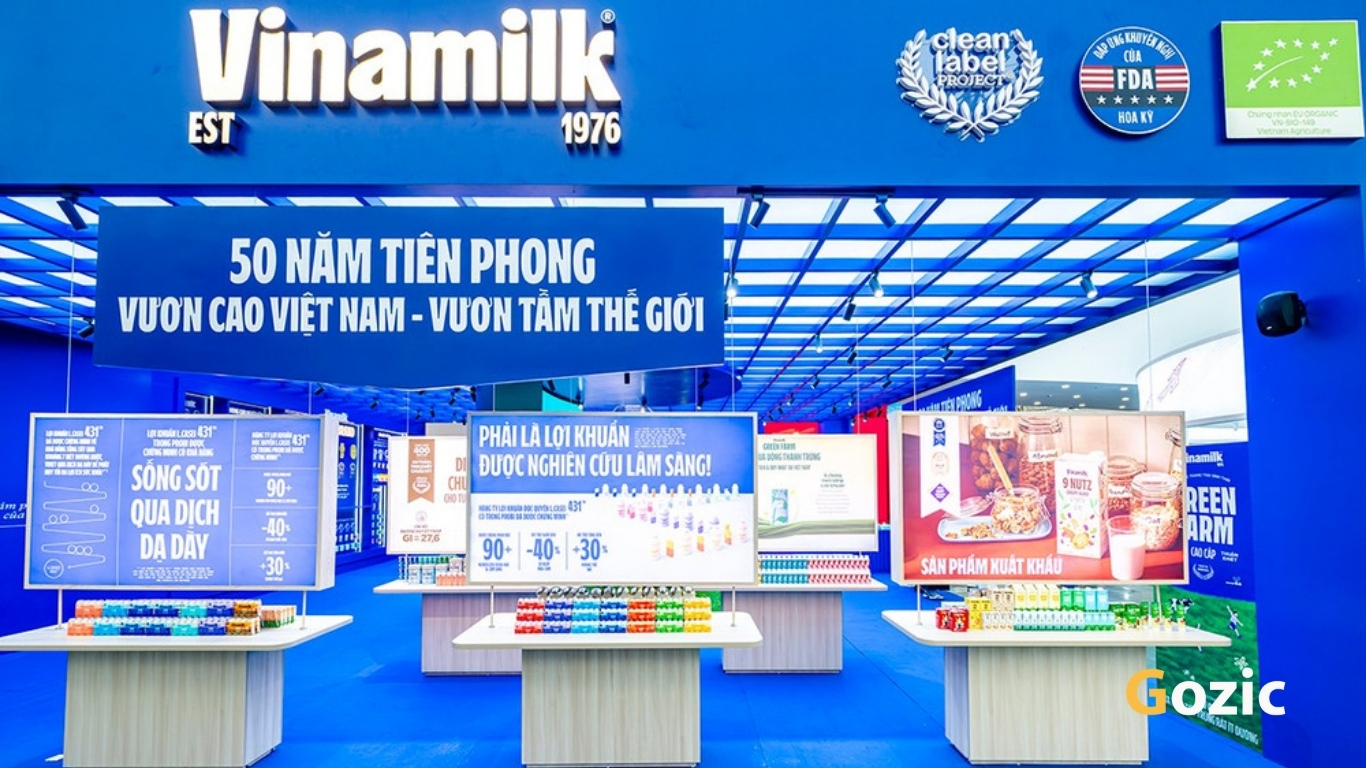 Tại quầy lạnh, standee, wobblers, banner treo, Logo Vinamilk nên đóng vai “cột mốc” dẫn đường. Hệ brand block thống nhất (logo + pháp lý + câu chữ ngắn) dùng lặp lại sẽ gia tăng nhận biết. Ở lối đi đông người, logo không cần to nhất, nhưng phải rõ nhất.
