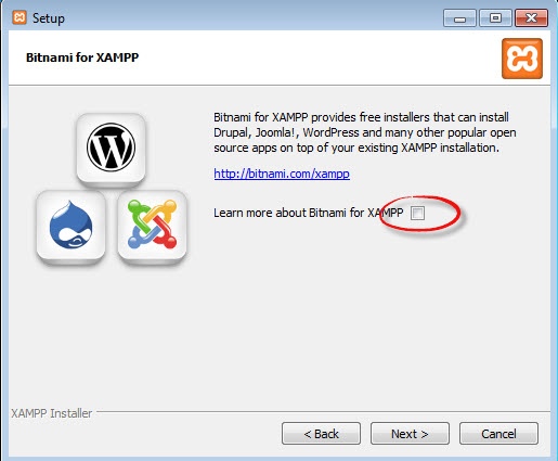 Ở trang kế tiếp, bạn bỏ chọn phần “Learn more about Bitnami for XAMPP“. Và ấn Next 2 lần nữa để bắt đầu quá trình cài đặt XAMPP.