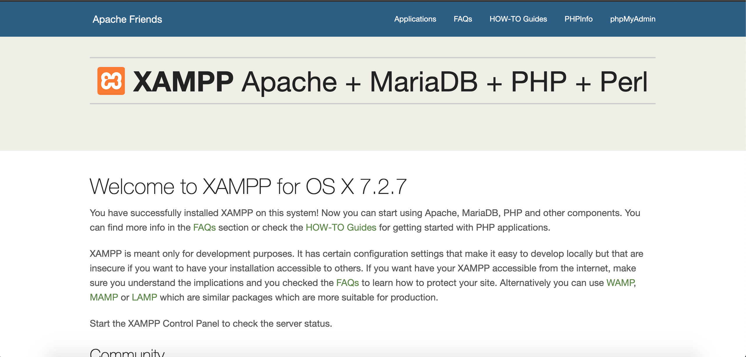 Sau khi khởi động xong, bạn hãy truy cập vào website với địa chỉ là http://localhost sẽ thấy nó hiển thị ra trang giới thiệu XAMPP như hình dưới.