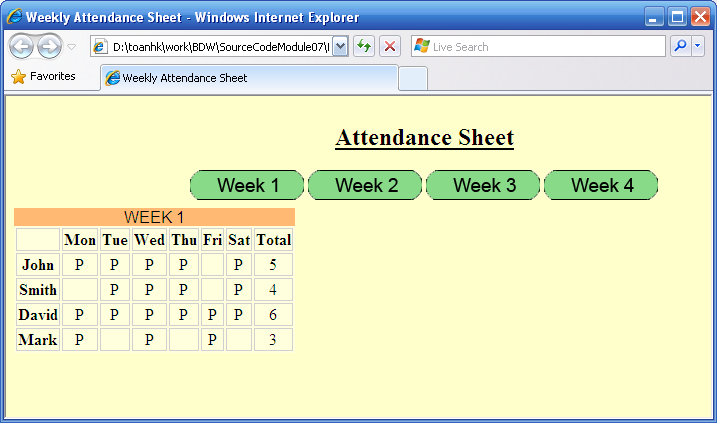 Thiết kế trang web này như sau: khi người dùng click vào các image week1,week2,week3, week4 thì tương ứng hiện lên các table tương ứng.