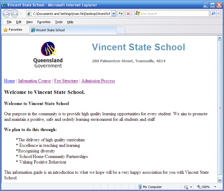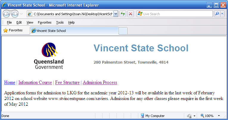 Dòng Link Home | Infomation Course | Fee Structure | Admission Process sẽ liên kết tương ứng đến các trang home.html, infomation.html, fee.html, admission.html và khi các liên kết này được click các trang luôn được mở ra trong 1 cửa sổ mới.