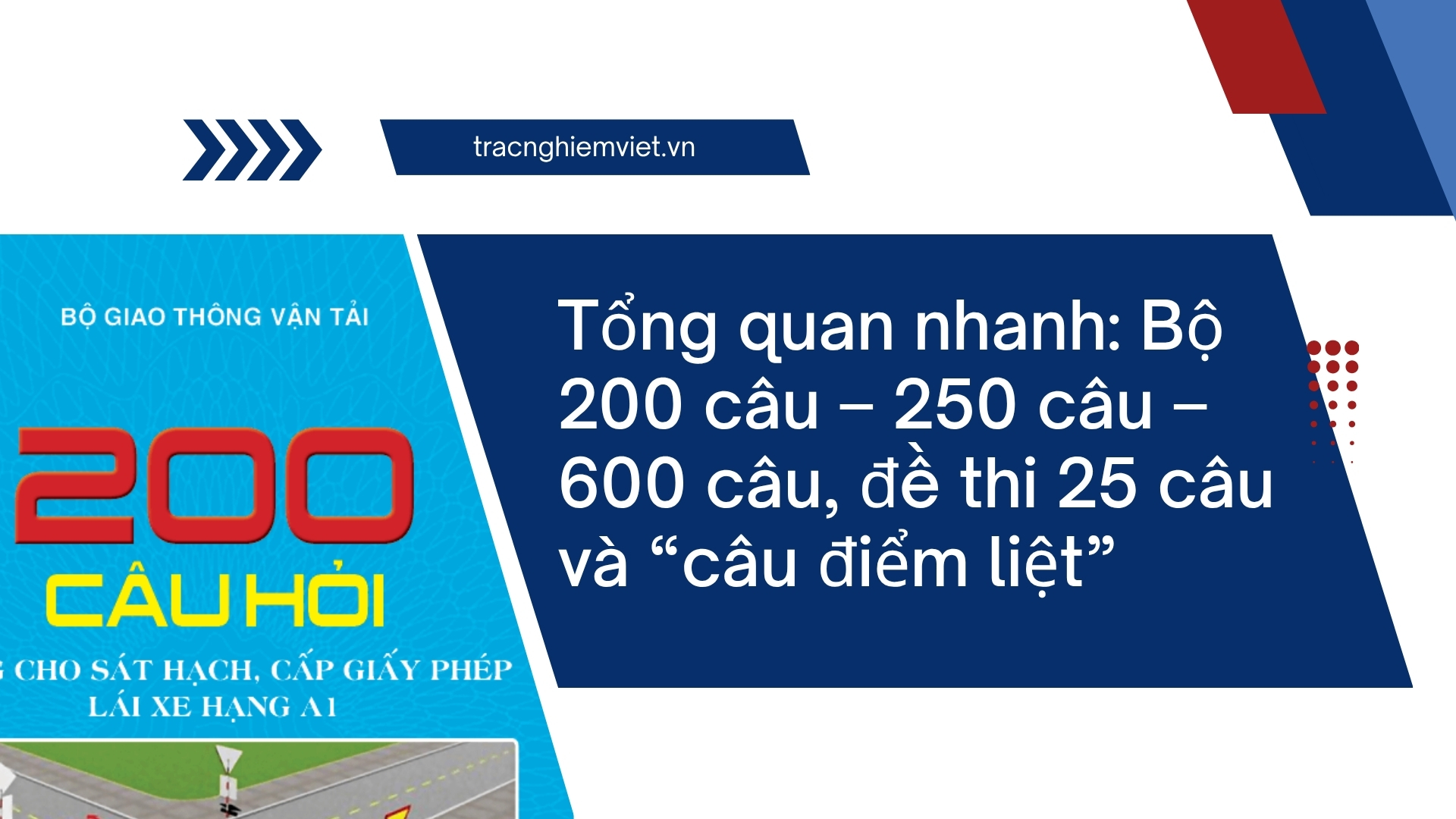 1. Tổng quan nhanh: Bộ 200 câu – 250 câu – 600 câu, đề thi 25 câu và “câu điểm liệt”